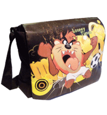Tazmanian Devil Football Messenger Bag. The bag has a wipe clean faux leather front with a durable polyester canvas body with a multitude of compartments and strong jaquard woven adjustable strap